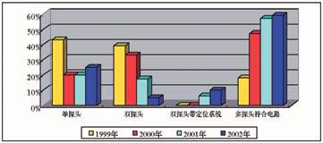 圖1 所示從1999年到2002年(2002年的數(shù)據(jù)是由上半年數(shù)據(jù)推算而來)單探頭、雙探頭、雙探頭帶定位系統(tǒng)和多探頭符合線路,四種不同核醫(yī)學設備每年各種類型所占比例?梢钥闯。最為明顯的是普通雙探頭在2002年僅僅占總數(shù)的5%,普通單探頭占總數(shù)25%,多探頭帶符合電路系統(tǒng)占總數(shù)59%。普通雙探頭帶X線定位系統(tǒng)占總數(shù)10%?梢钥闯鰡翁筋^SPECT和多探頭符合電路系統(tǒng)呈增長趨勢,尤其以多探頭符合電路系統(tǒng)更為明顯。